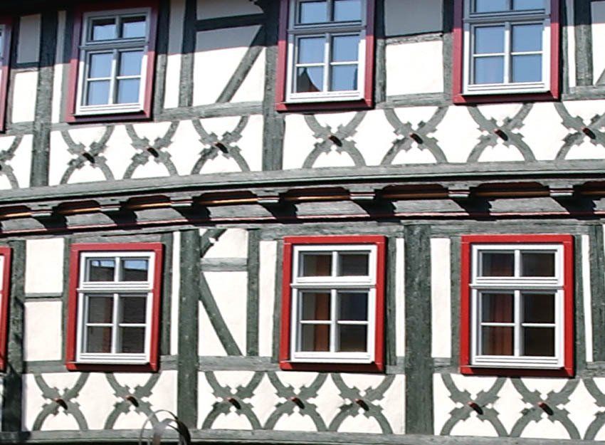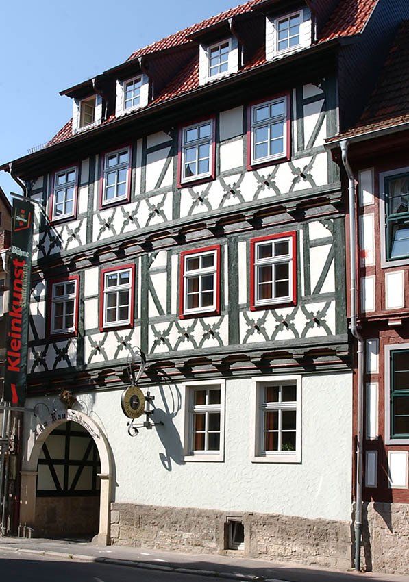 Der vorherrschend mit Andreaskreuzen geschmückte Rautenkranz stammt aus der Mitte des 16. Jh. und wurde mehrfach umgebaut und erweitert. Sein Name verweist dabei auf eine einst im Hintergebäude betriebene Schankwirtschaft mit Tanzsaal, die bereits zu früheren Zeiten ein beliebter Ort für gesellige Stunden war.
